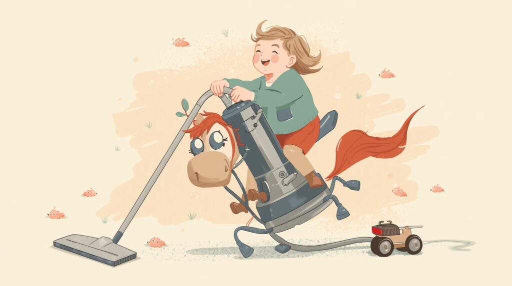 子どもをちょっと乗せて“掃除機列車”にしたり、ホコリを「モンスター退治」にして大げさに吸い込む。